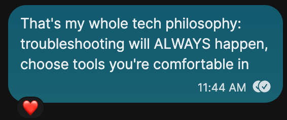 “That’s my whole tech philosophy: troubleshooting will ALWAYS happen, choose tools you’re comfortable in”